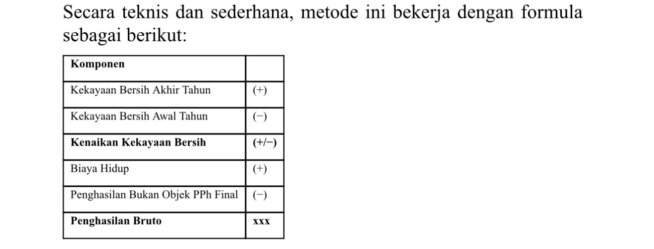 Formula di atas merupakan kerangka dasar yang digunakan dalam pendekatan ini. Namun perlu ditekankan, dalam praktik pemeriksaan pajak, setiap komponen dalam formula tersebut tidak dapat diperlakukan sebagai angka asumsi semata. Seluruhnya harus dapat dijelaskan secara logis, didukung bukti, serta konsisten dengan kondisi ekonomi Wajib Pajak yang sebenarnya.