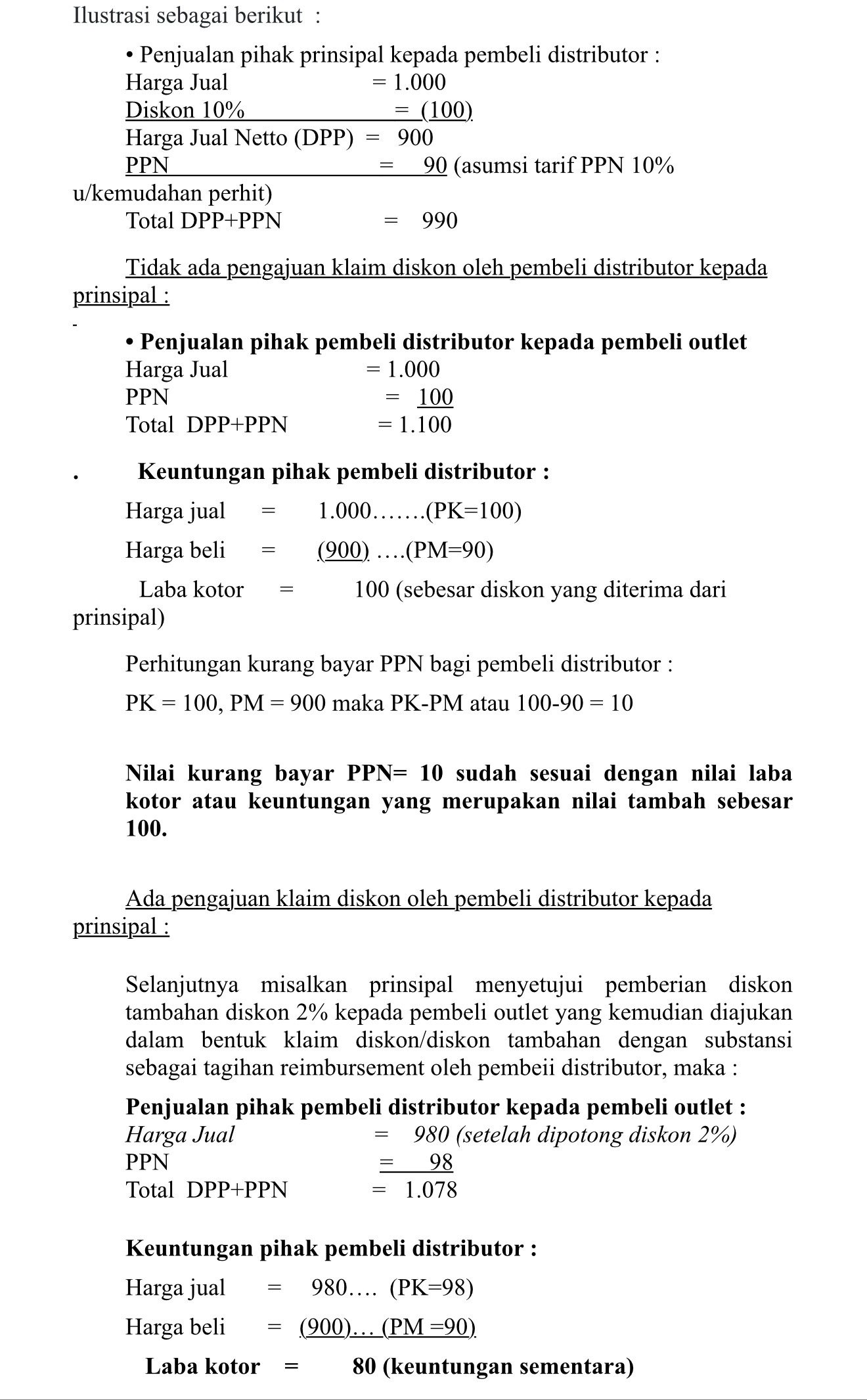 Sehingga diskon tambahan yang diberikan penjual prinsipal kepada outlet melalui distributor dianggap tidak memenuhi definisi potongan harga(diskon), tidak dapat mengurangi jumlah penjualan/peredaran usaha.
