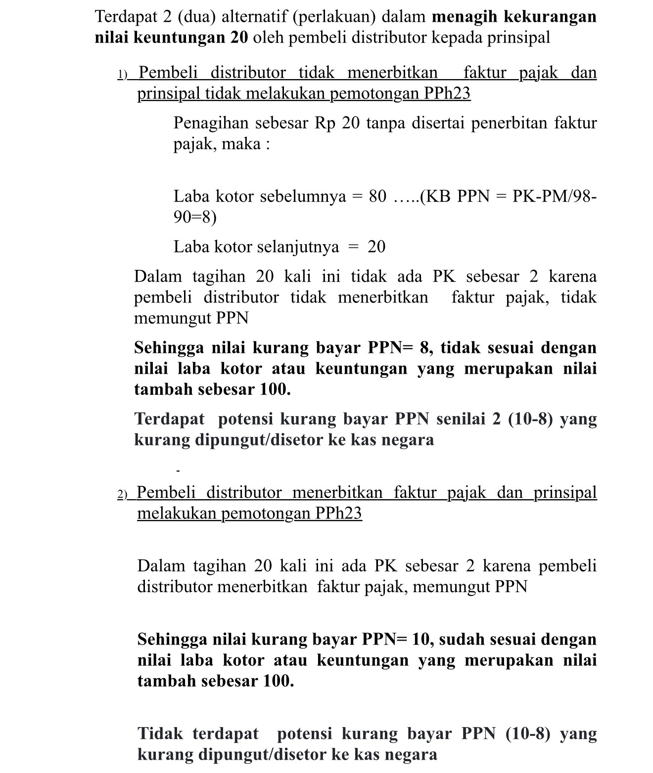 1. Dalam hal pada akhirnya yang diminta untuk dijalankan oleh otoritas perpajakan adalah  alternatif ke-2 , walaupun subtansinya klaim diskon/diskon tambahan merupakan tagihan reimbursement yang tidak terutang PPh 23 maupun PPN namun oleh karena disebabkannilai kurang bayar PPN yang tidak sesuai dengan nilai keuntungan (laba kotor) yang notabena merupakan nilai  tambah suatu transaksimaka tagihan reimbursement diperlakukan sebagai suatu tagihanjasa, seolah terdapat pemberian jasa.