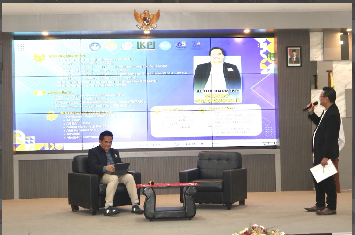 IKPI, Manado: Ketua Umum Ikatan Konsultan Pajak Indonesia (IKPI) Vaudy Starworld menyampaikan kuliah umum di Fakultas Ekonomi dan Bisnis FEB) Universitas Sam Ratulangi (Unsrat) Manado dalam rangkaian kunjungan edukasi IKPI di Sulawesi Utara. Kegiatan ini juga ditandai dengan penandatanganan MoU antara IKPI dan Fakultas Ekonomi dan Bisnis Unsrat untuk memperkuat kolaborasi pengembangan akademik dan praktik perpajakan.
