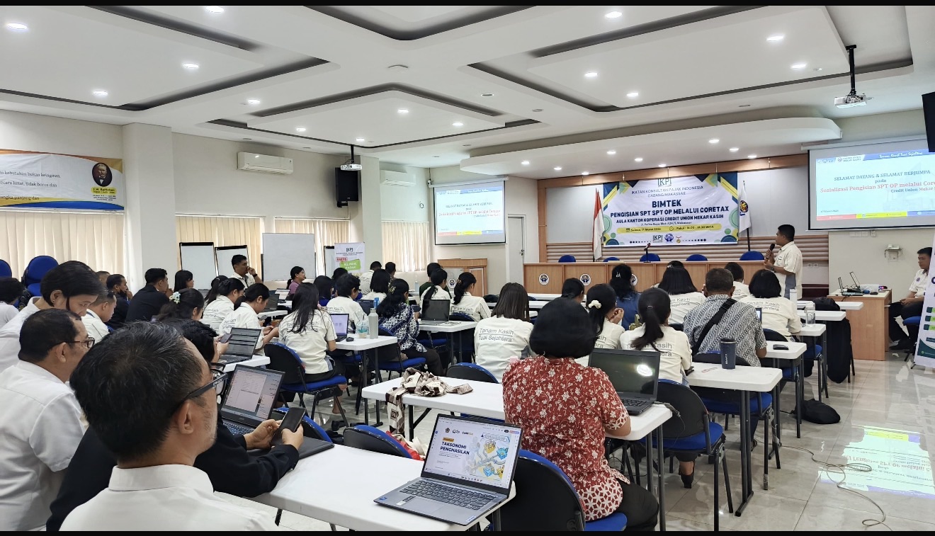 IKPi, Makassar: Ikatan Konsultan Pajak Indonesia (IKPI) Cabang Makassar menggelar bimbingan teknis (Bimtek) pelaporan Surat Pemberitahuan (SPT) Tahunan Orang Pribadi Tahun Pajak 2025 berbasis Coretax bagi pengurus dan anggota Credit Union Mekar Kasih, sebagai upaya meningkatkan pemahaman wajib pajak dalam menghadapi sistem administrasi perpajakan terbaru.