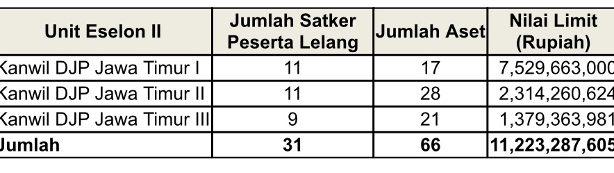 Kegiatan ini melibatkan seluruh unit eselon I Kementerian Keuangan di wilayah Jawa Timur. Selama sepekan, dari 6 hingga 10 Oktober 2025, sebanyak 69 lot aset dilelang secara daring melalui situs resmi lelang.go.id, dengan total nilai limit mencapai Rp11,4 miliar.