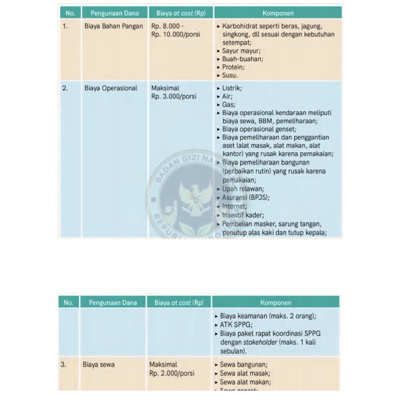 Dalam petunjuk teknis pembuatan rekening SPPG dan penggunaan dana makan bergizi gratis yang disusun oleh Kedeputian Sistem dan Tata Kelola Badan Gizi Nasional pada Agustus 2025 pada poin 5.3 alokasi penggunaan dana dinyatakan bahwa Program MBG dilakukan dengan mekanisme Banper dengan nilai sebesar Rp13.000/Porsi dan Rp15.000/Porsi. Komponen dana Banper terdiri dari biaya bahan pangan, biaya operasional dan biaya sewa dengan rincian sebagai berikut: