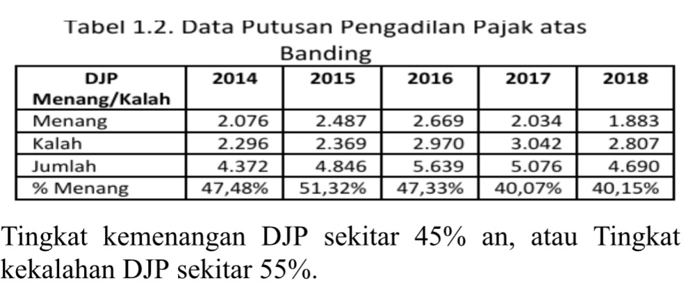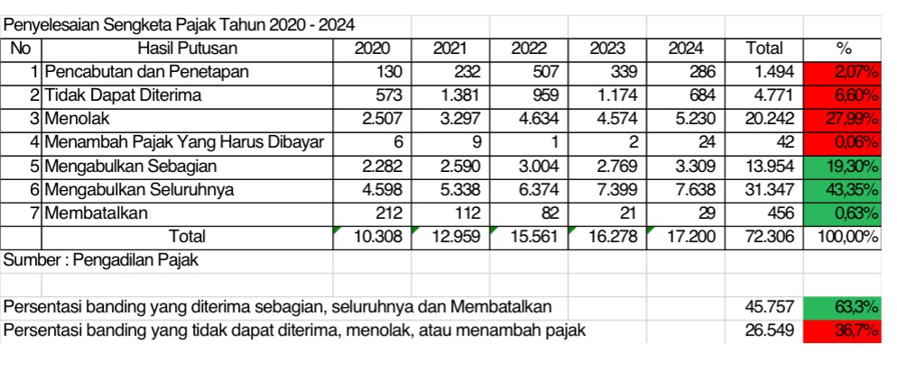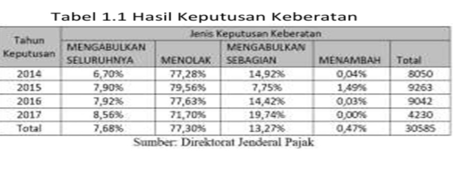 Namun, dalam praktiknya, sebagian besar proses keberatan tidak berhenti di tingkat DJP. Data menunjukkan bahwa rasio keberatan yang dikabulkan sebagian atau seluruhnya hanya berkisar antara 15% hingga 25% per tahun (Supriyadi, Beny Setiawan, dan Randy Matius Bintang, 2018). Sebaliknya, mayoritas wajib pajak melanjutkan ke proses banding di Pengadilan Pajak, di mana tingkat kemenangan wajib pajak bahkan mencapai lebih dari 63% pada periode 2020–2024.